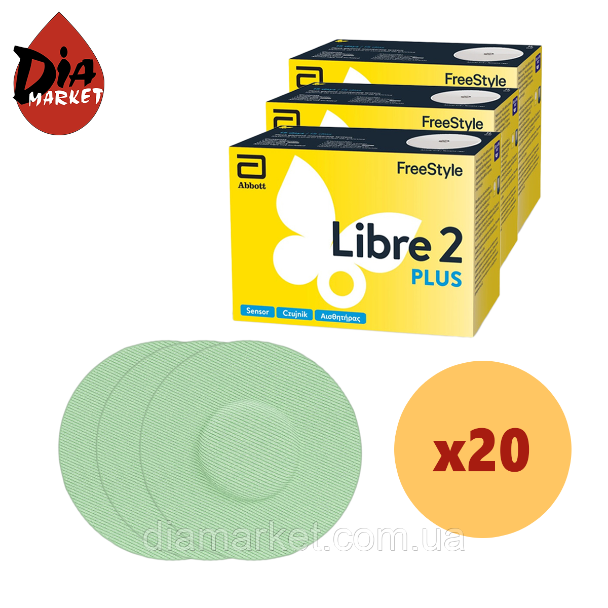 Цей комплект містить 20 сенсорів Freestyle Libre 2 Plus і двадцять кольорових тейпів для зручності використання.